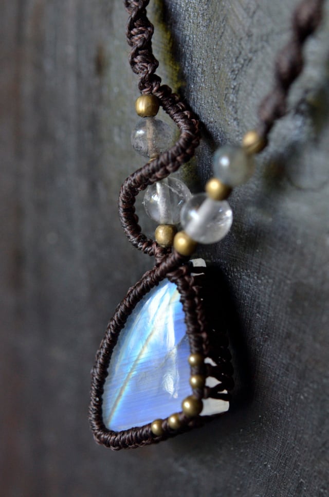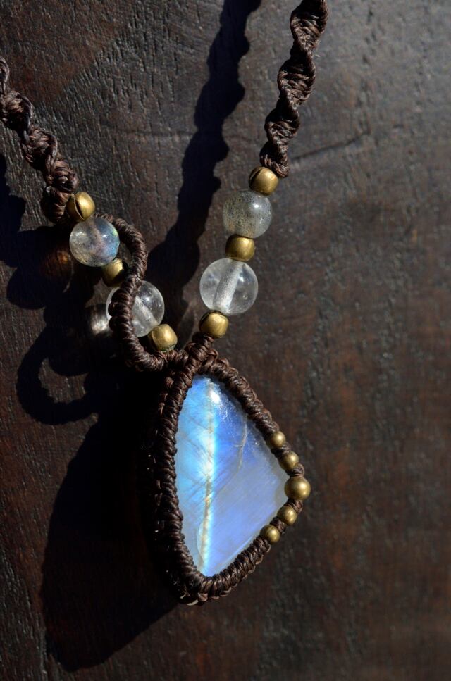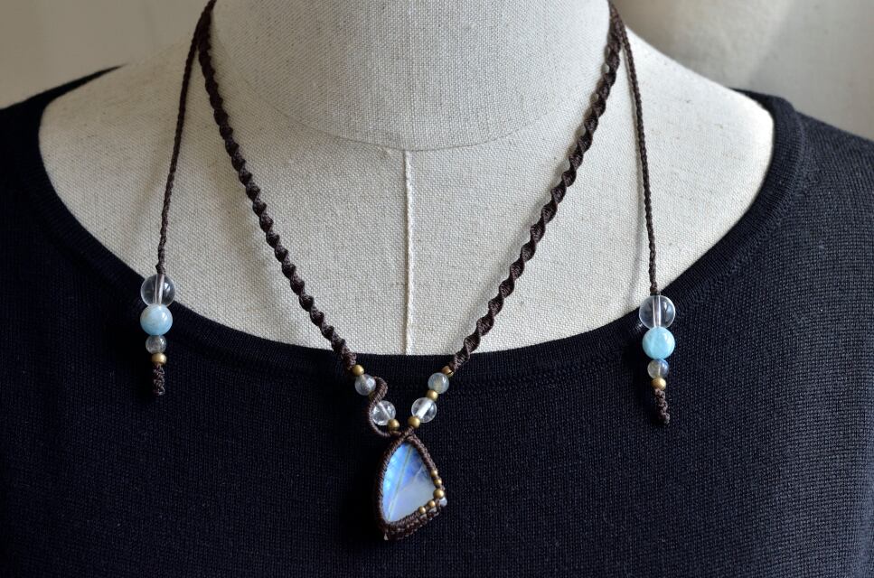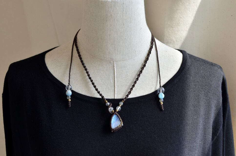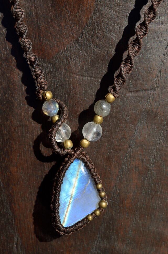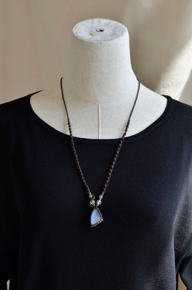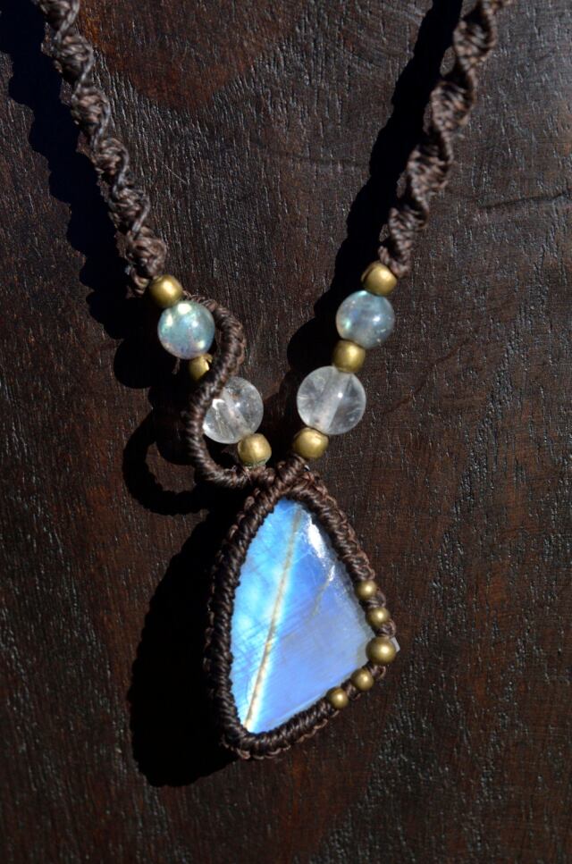 虹色に輝く光が神秘的なレインボームーンストーンマクラメ編みネックレス。接着剤は一切使用せず、マクラメ技法によって、ひと編みひと編み丁寧に編み上げています。