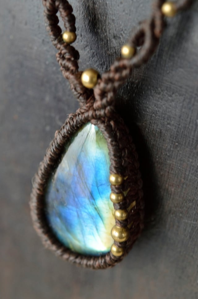 光の角度により、深いブルーからイエローと様々な輝きを見せる高品質マルチカラーラブラドライトを使用したマクラメ編みネックレス。接着剤は一切使用せず、マクラメ技法によって、ひと編みひと編み丁寧に編み上げています。