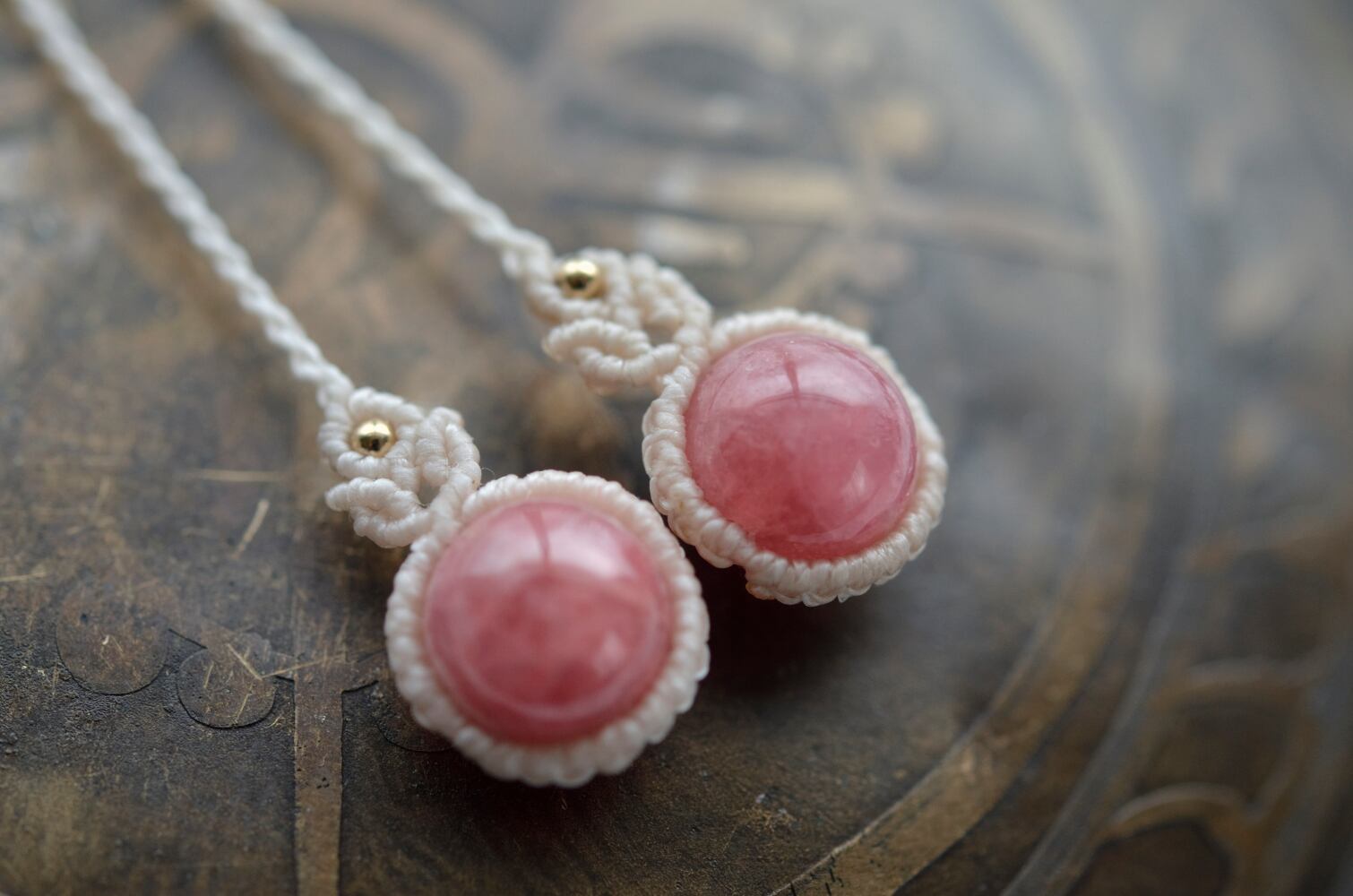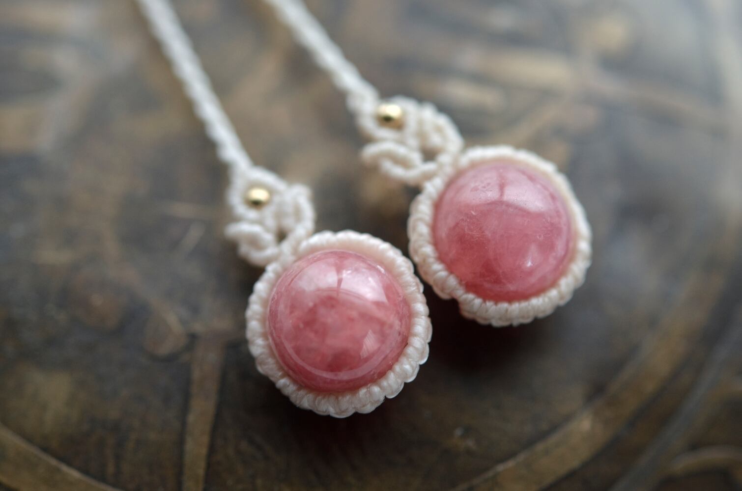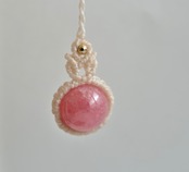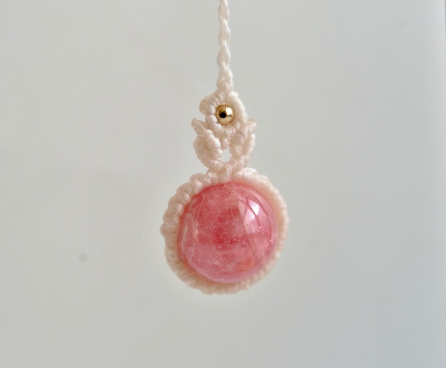 インカローズの鮮やかなピンク色が引き立つように、優しい生成色のレースでひと編みひと編み丁寧に編み上げ、天然石の個性が、より引き立つように仕上げました。