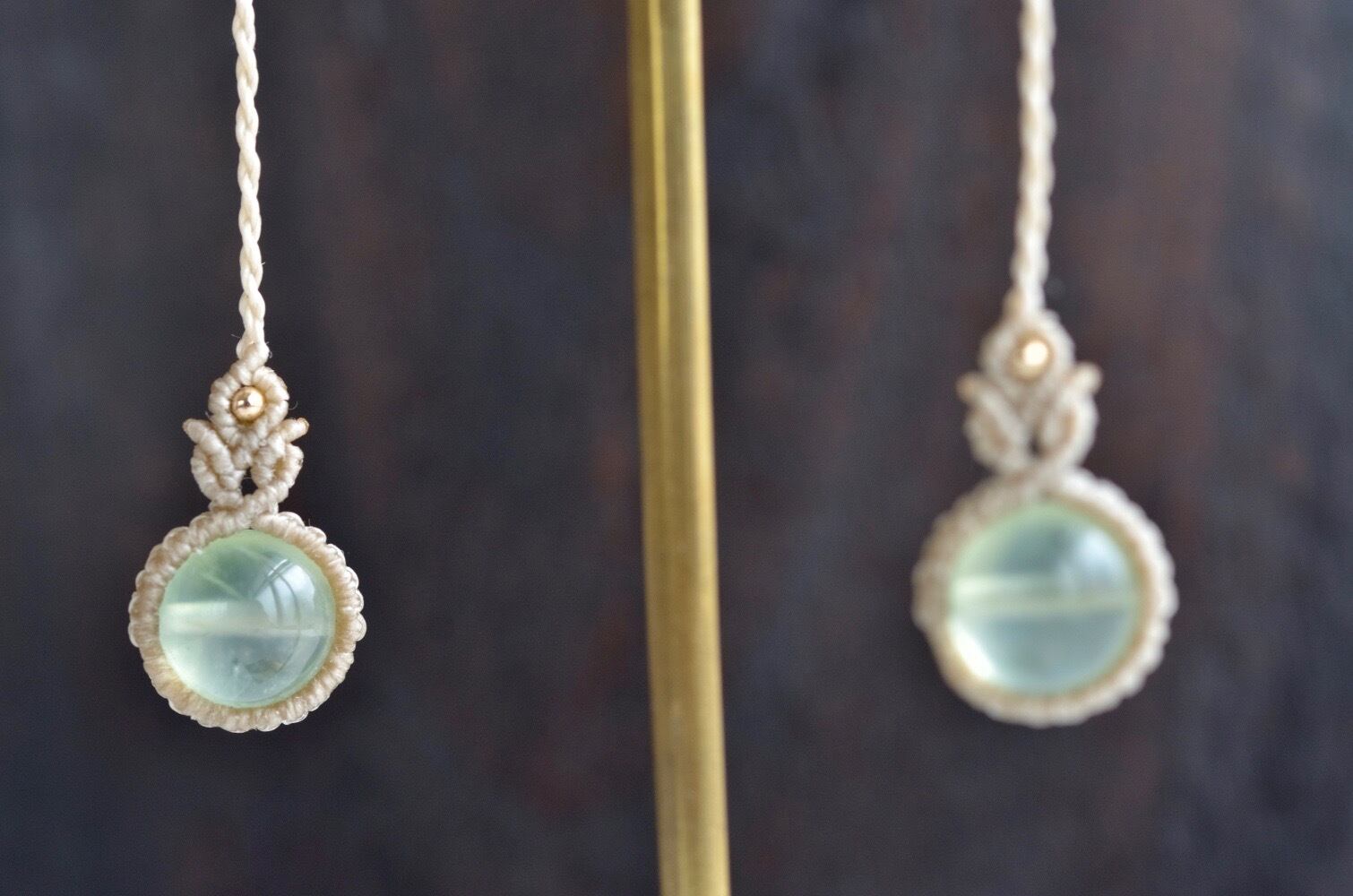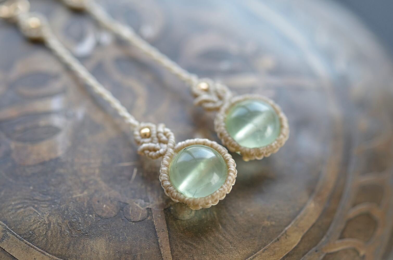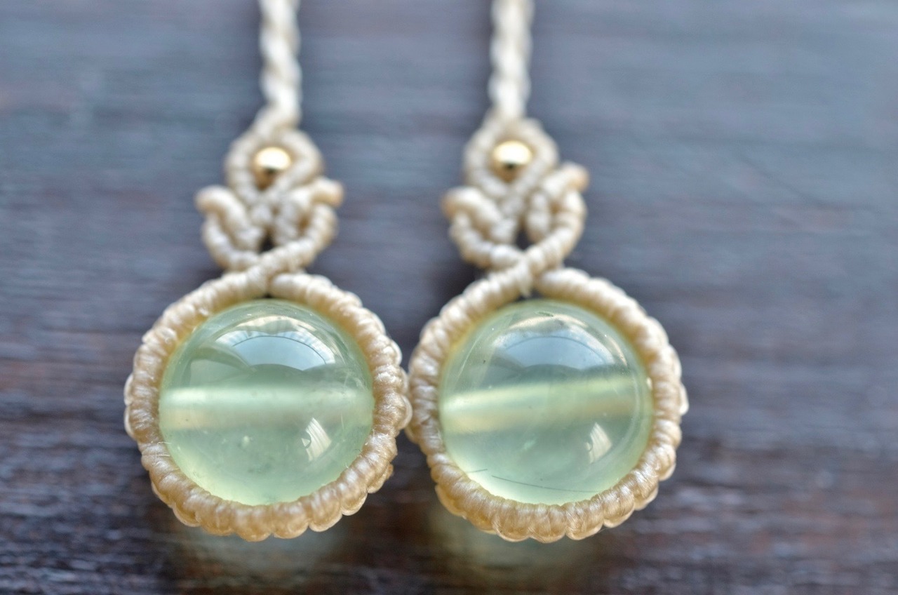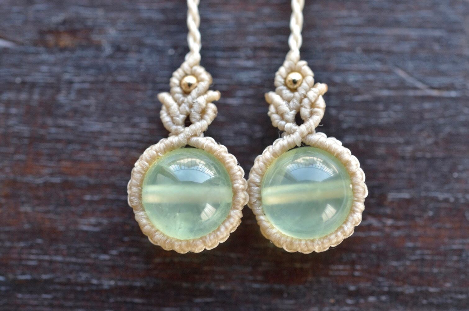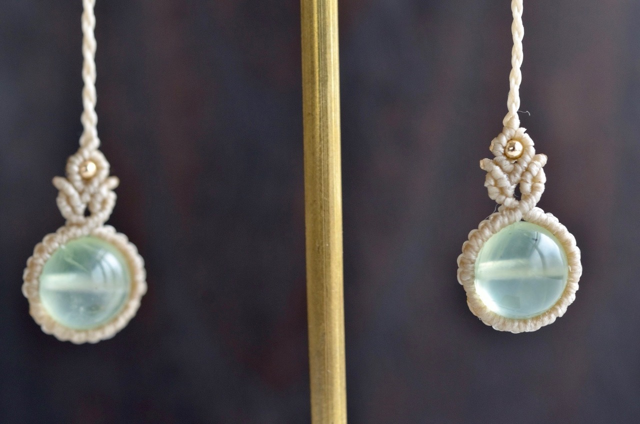 透明感ある淡いグリーンのプレナイトが引き立つように、淡いアースカラーのレースでひと編みひと編み丁寧に編み上げ、天然石の個性が、より引き立つように仕上げました。