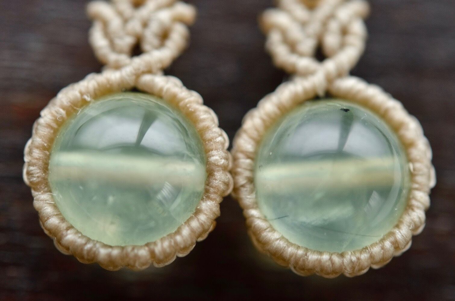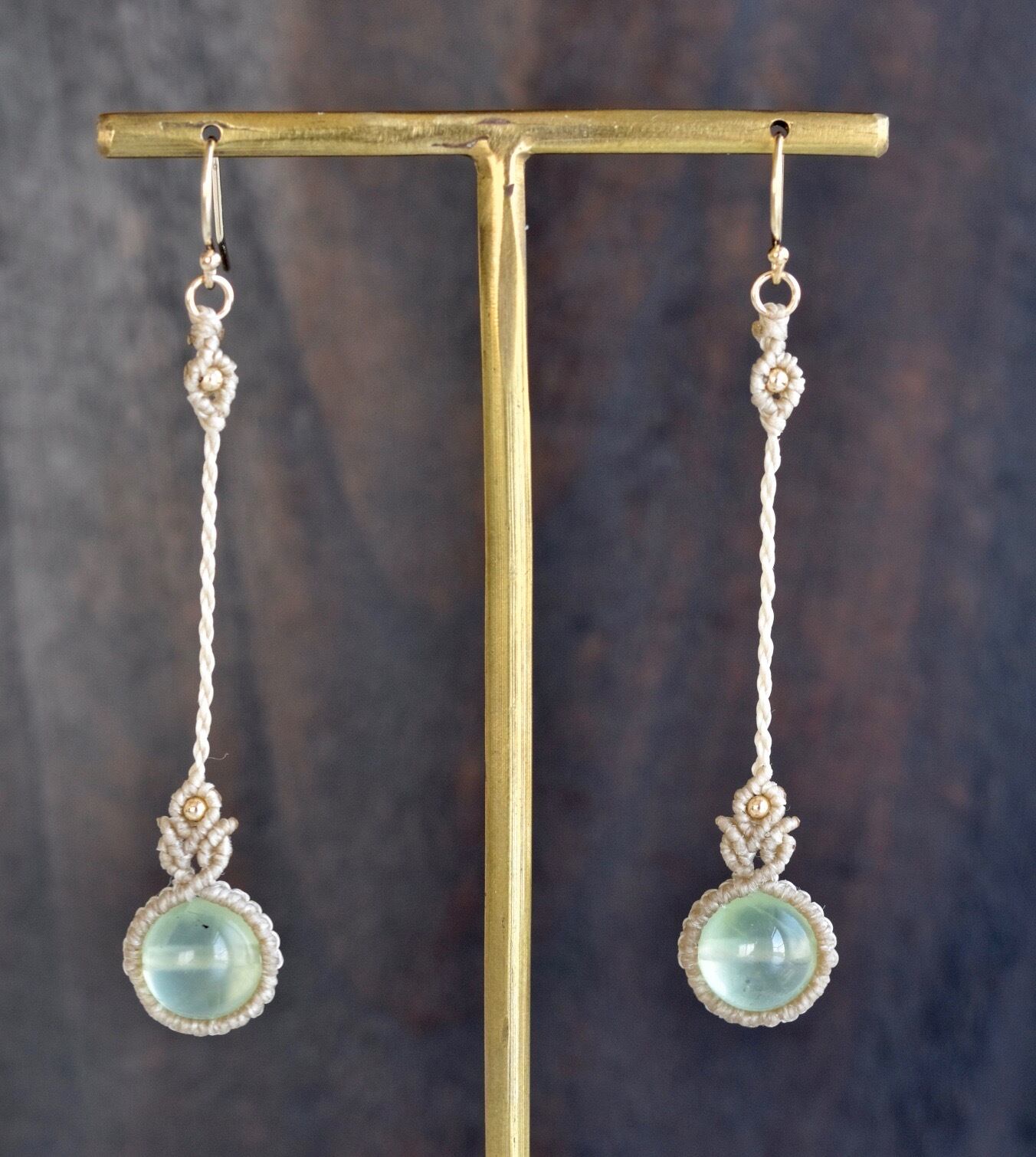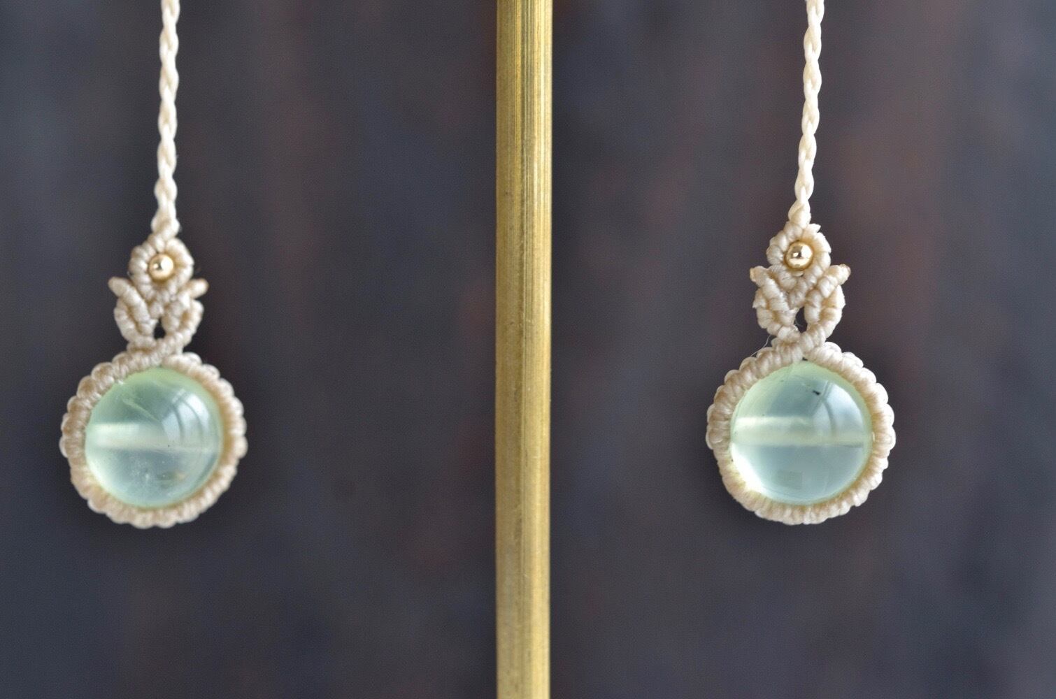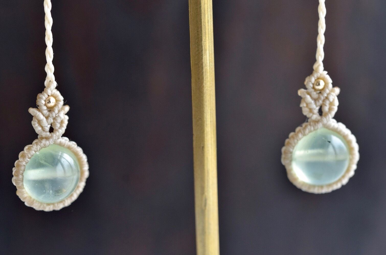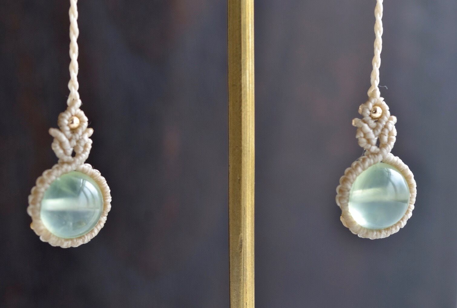 透明感ある淡いグリーンのプレナイトが引き立つように、淡いアースカラーのレースでひと編みひと編み丁寧に編み上げ、天然石の個性が、より引き立つように仕上げました。