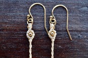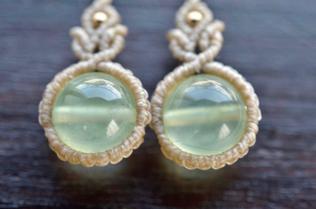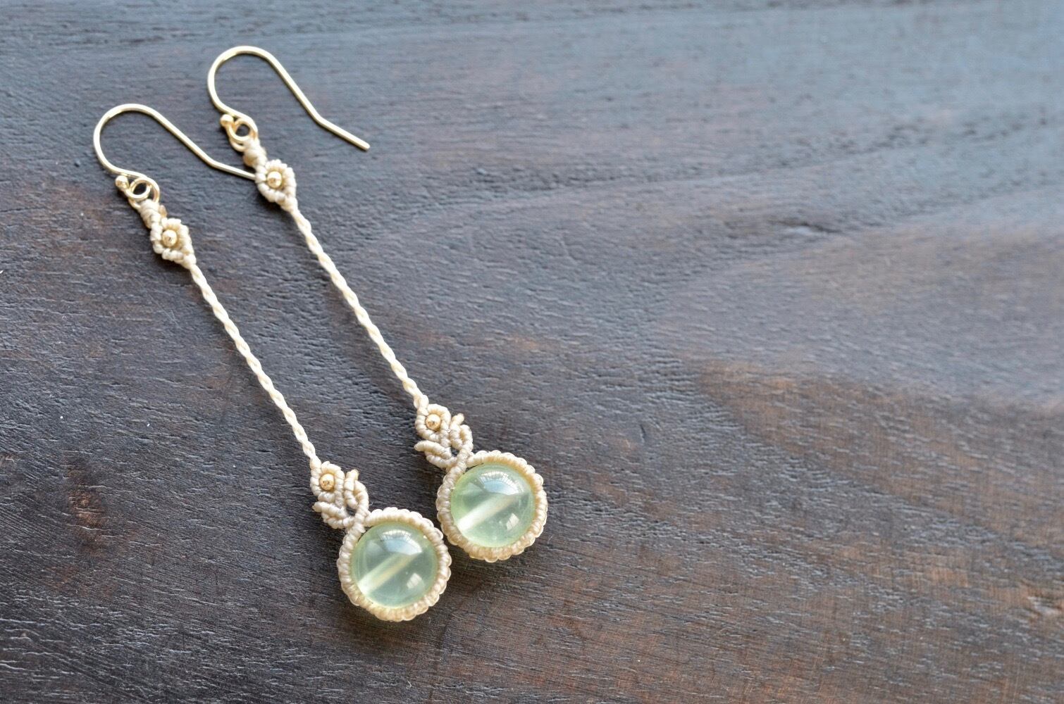 マスカットの粒のような淡いグリーンが美しいプレナイトビーズに、14kgfビーズをあしらった上品で、シンプルなマクラメピアス。
