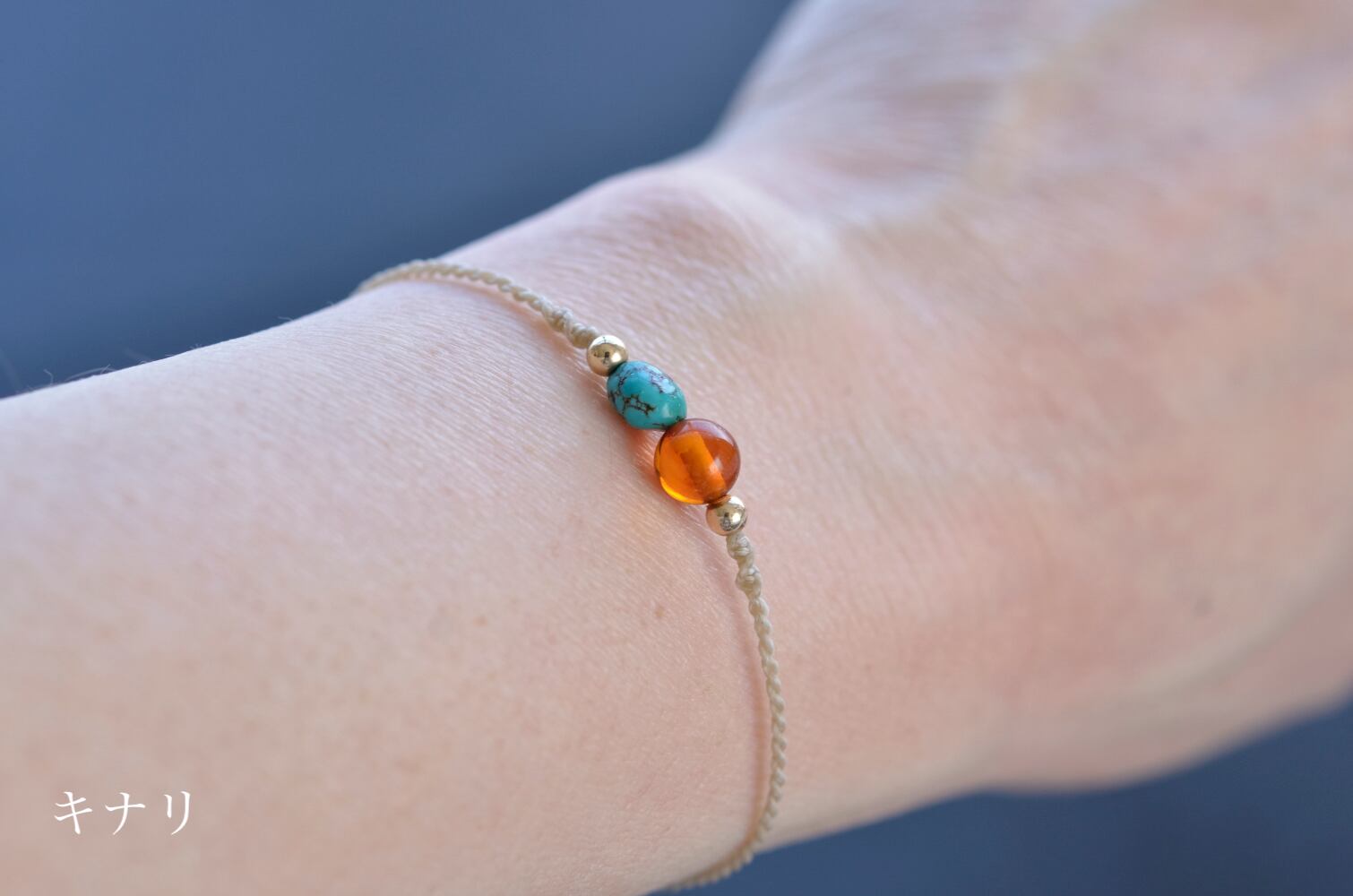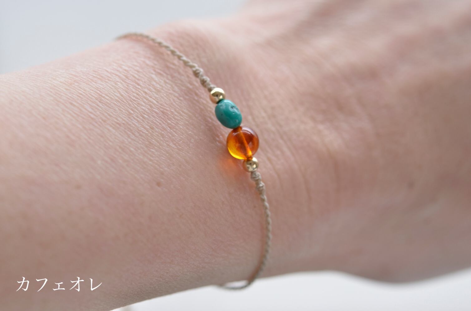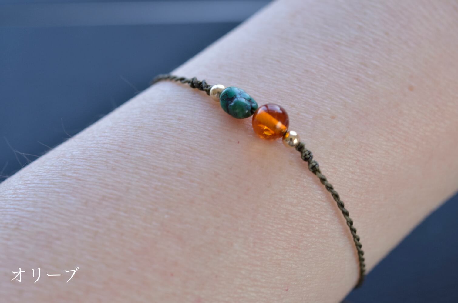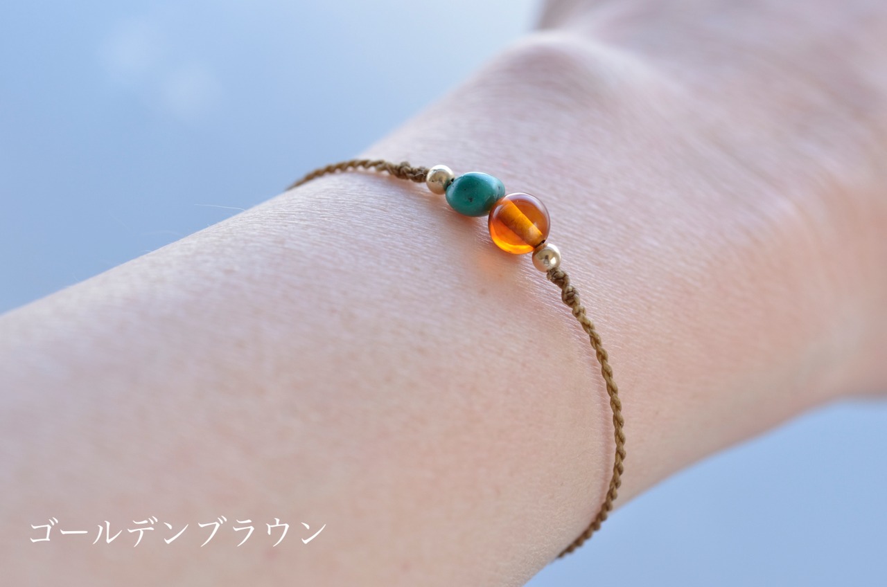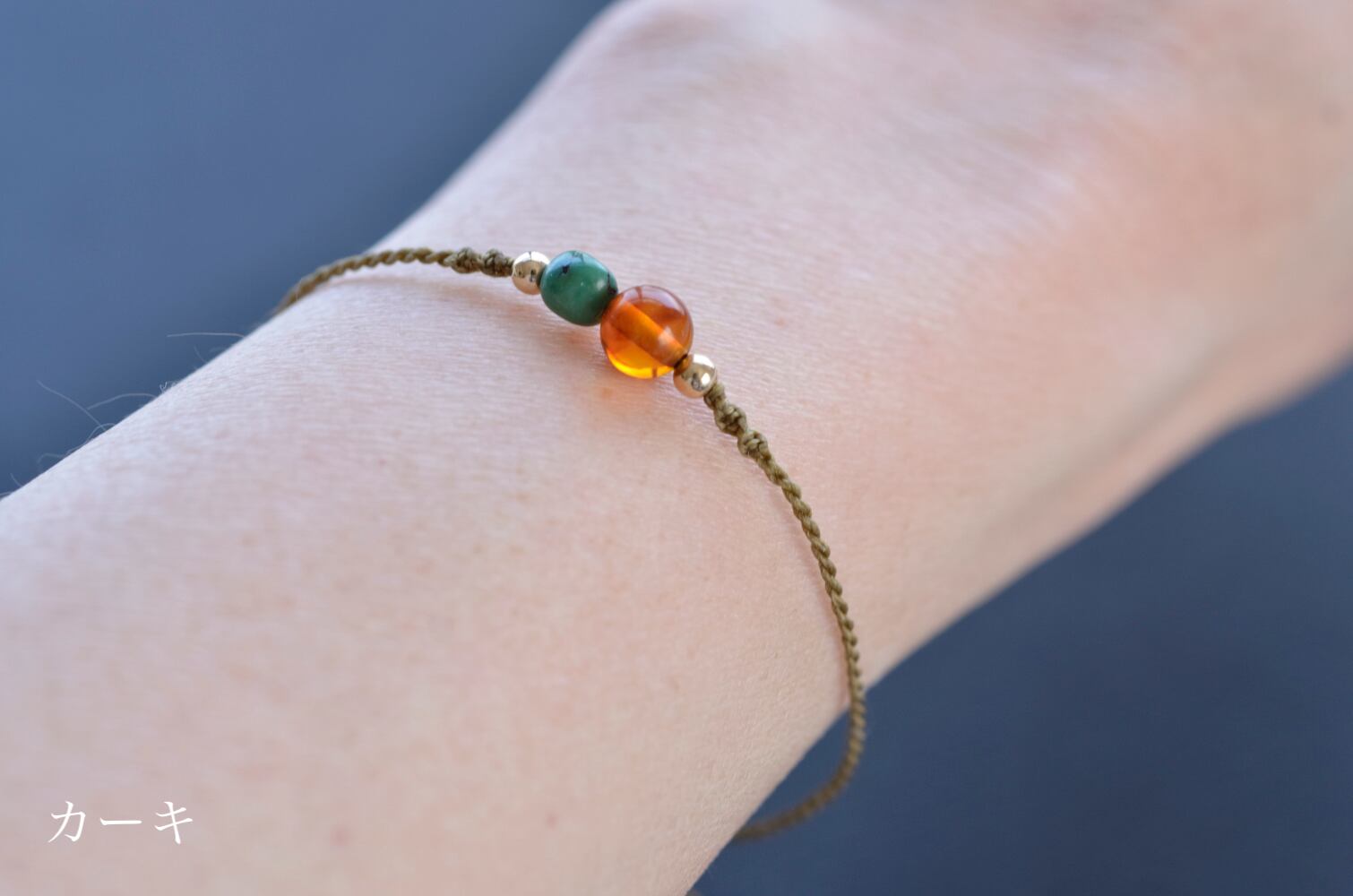 小粒のターコイズビーズとアンバービーズをアクセントにしたシンプルなマクラメブレスレット。極細糸で編み上げている為、上品な印象で、柔らかく、つけ心地の良いブレスレットです。肌馴染みの良い9色をセレクトし、日常使いから、ちょっとしたお出かけのアクセントに、幅広いシーンでご使用頂けます。