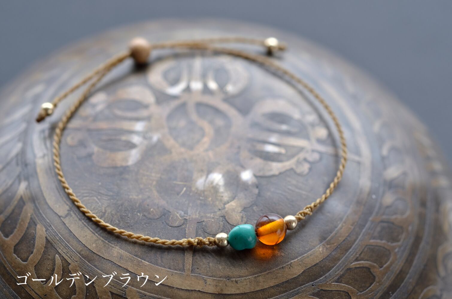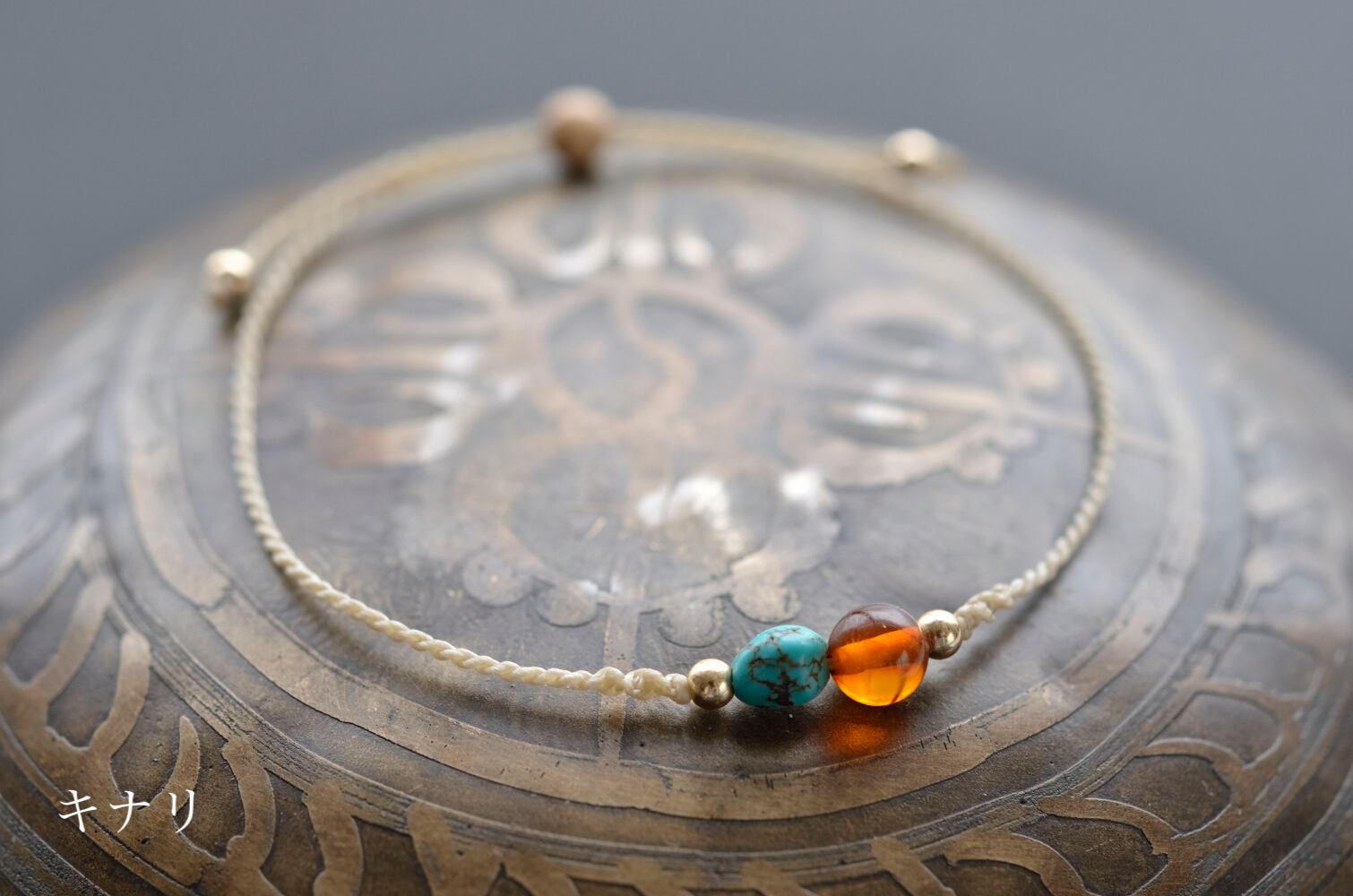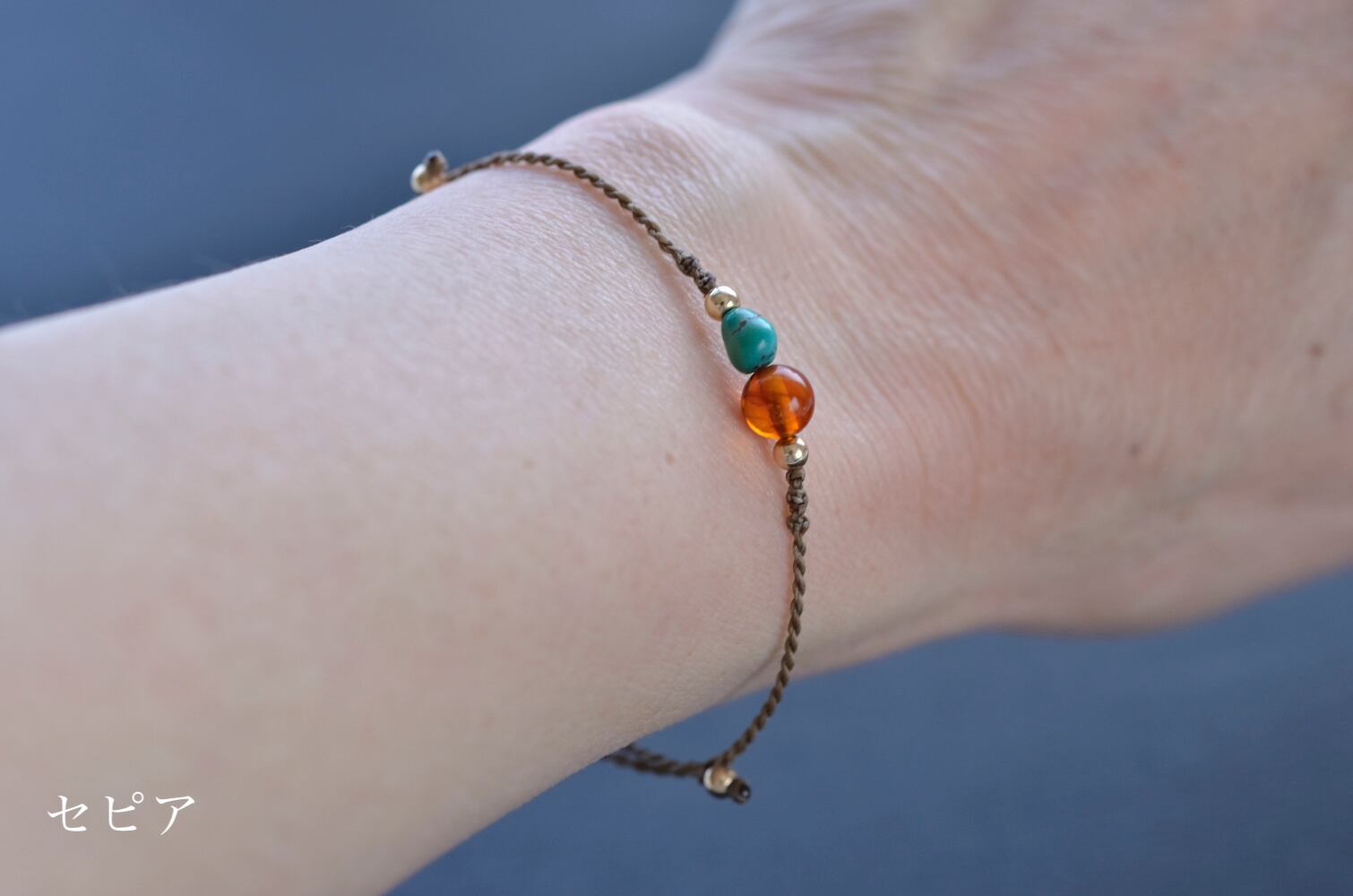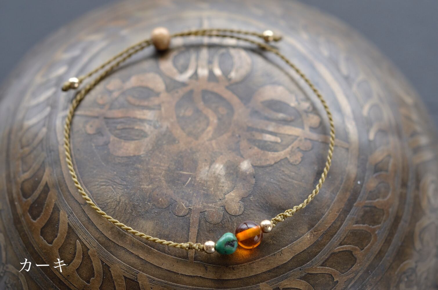 小粒のターコイズビーズとアンバービーズをアクセントにしたシンプルなマクラメブレスレット。極細糸で編み上げている為、上品な印象で、柔らかく、つけ心地の良いブレスレットです。肌馴染みの良い9色をセレクトし、日常使いから、ちょっとしたお出かけのアクセントに、幅広いシーンでご使用頂けます。