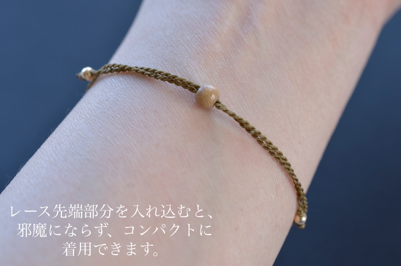 ※レースの長さを調整する際は、腕に通した後、ブレスレットを通した方の中指と手のひらで、手のひらに近い方のレース先端の14kgfビーズ部分を固定し、もう片方の手でウッドビーズを押さえながら、片方ずつゆっくり調整すると簡単に調整できます。繊細糸で仕上げておりますので、装着時に強く引っ張ると、破損に繋がる可能性がございます。